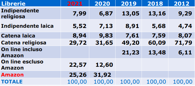 - Dopo essere esplosa nell’anno della pandemia a scapito delle librerie religiose, Amazon si stabilizza su livelli inferiori al 2020 a favore delle librerie on line tradizionali.