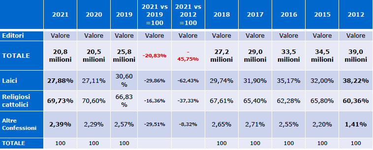 - La ripartizione tra editori religiosi e laici appare stabilizzata, ma la quota di mercato dell’editoria laica ormai è costantemente sotto il 30%.