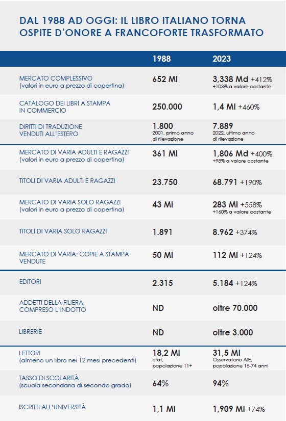 Rispetto al 1988, quando l’Italia era come oggi Paese Ospite d’Onore a Francoforte, il mercato nazionale è raddoppiato di valore, al netto dell’inflazione (vedi tabella nella terza pagina). Nel 1988 si vendevano nelle librerie e nei supermercati circa 50 milioni di libri ogni anno, nel 2023 (nel frattempo si sono aggiunte le librerie online) le copie vendute sono state 112 milioni, al netto dei libri scolastici, dell’editoria accademica e professionale, dei libri in formato digitale. Significativo è stato inoltre il balzo dal periodo prepandemia a oggi: rispetto al 2019, nel 2023 si sono vendute 12,5 milioni di copie in più, un balzo di quasi il 13% che ha visto protagonisti nuovi pubblici giovanili che si informano su nuovi mezzi e trainano la crescita di nuovi generi come il fumetto e il romance.