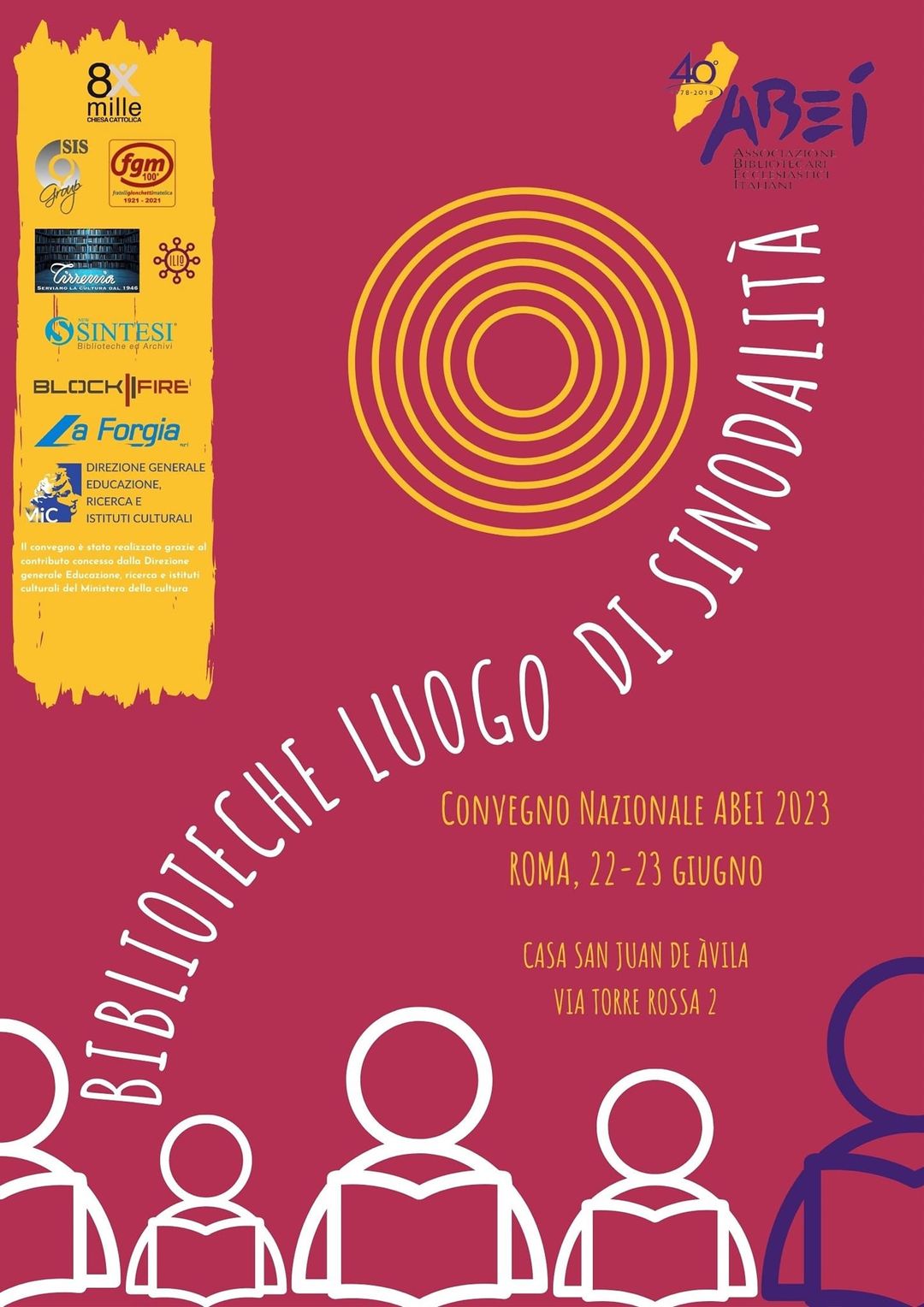 Il Convegno di Studio “Biblioteche: luogo di sinodalità” si svolgerà a Roma presso la Casa San Juan de Avila dalle 15.00 del 22 Giugno al pomeriggio del 23 Giugno; dopo l’ultima sessione dei lavori si svolgerà l’assemblea elettiva per il rinnovo delle cariche sociali per il quinquennio 2023-2028.