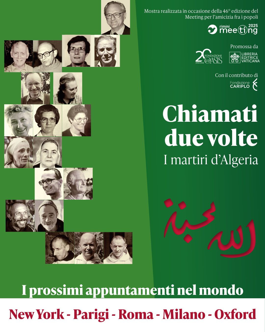 La mostra Chiamati due volte. I martiri d’Algeria, realizzata dalla Fondazione Oasis e dalla Libreria Editrice Vaticana per il Meeting di Rimini 2025, dove ha attratto oltre 15.000 visitatori in 6 giorni, nasce dal desiderio di raccontare la vicenda dei 19 religiosi e religiose, tra cui i sette monaci di Tibhirine e il Vescovo di Orano Pierre Claverie, uccisi in Algeria tra il 1994 e il 1996. La loro vicenda si inserisce nel cosiddetto “decennio nero” (1992-2002), un periodo drammatico in cui il terrorismo islamista colpì duramente l’Algeria, provocando oltre 150.000 vittime tra cui molti imam che si rifiutarono di giustificare la violenza.