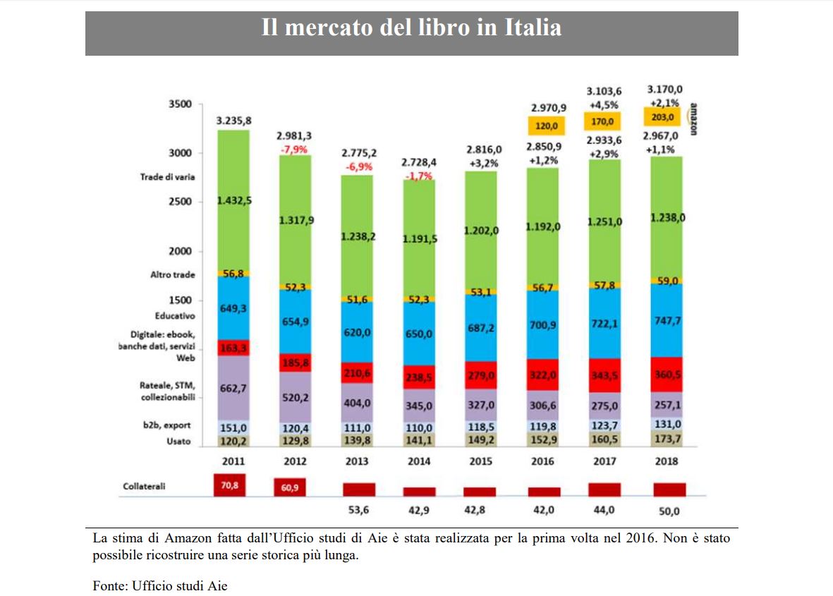 Il mercato del libro ha chiuso il 2018 con un fatturato di 3,170miliardi di euro, in crescita del 2,1% rispetto all’anno precedente, consolidando il risultato del 2017 (+4,5%). Nel dato è compreso il peso di Amazon (stimato da AIE) e l’usato (il cosiddetto «secondo mercato»). Questo risultato conferma che, a parità di perimetro di mercato e al netto dei ricavi pubblicitari, della spesa per l’acquisto di hardware e dispositivi per l’accesso ai contenuti e dei contributi pubblici, l’industria editoriale resta la prima industria culturale del Paese.